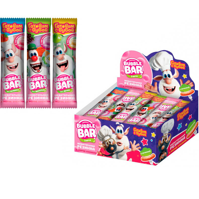 ГОТОВИМ С БУБОЙ BUBBLE BAR Жевательная резинка с начинкой в форме сосиски 1кор*24бл*30шт, 15гр