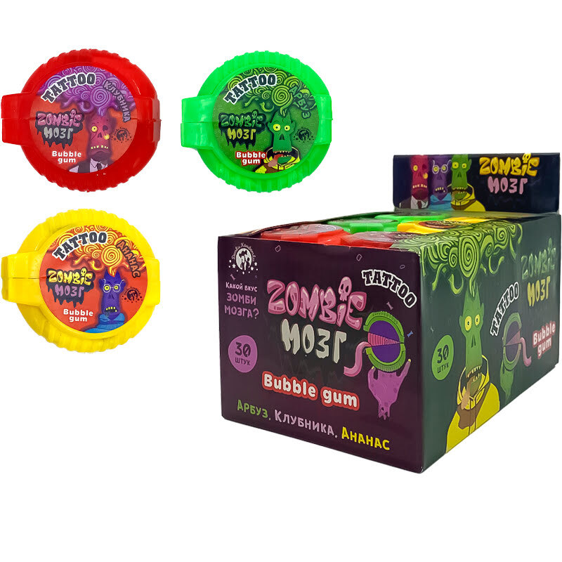 Жевательная Резинка Мозг Zombie ассорти с татуировкой рол 1кор*24бл*30шт, 12гр
