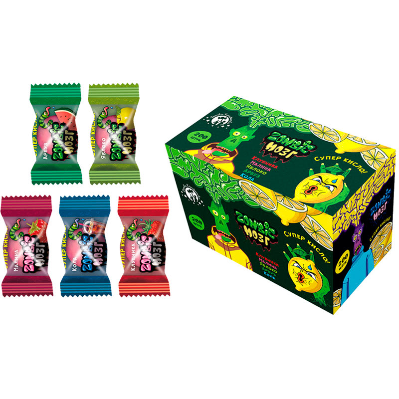 Жевательная резинка Zombie мозг ассорти вкусов кислые 1кор*10бл*200шт, 3гр